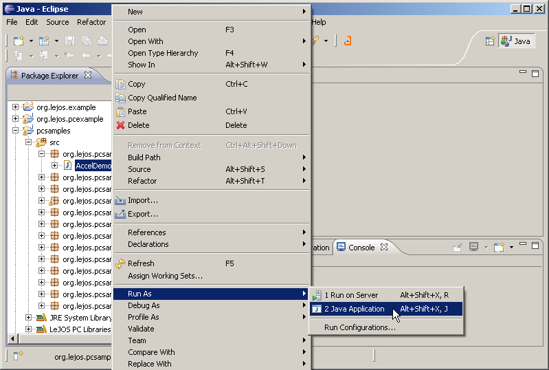 кликните правой кнопкой мыши на классе, который содержит метод Обратите внимание: не выбирайте "Run As"→"Java Application" т.к. это приведёт к локальному запуску программы на обычной виртуальной машине Javaи со стандартным Java runtime. Это не сработает и обычно приводит к ошибкам.
